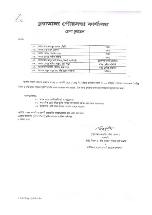 দারিদ্র নিরসন ও বস্তি উন্নয়ন বিষয়ক স্থায়ী কমিটির মাসিক সভার রেজুলেশন জানু-মার্চ-২১