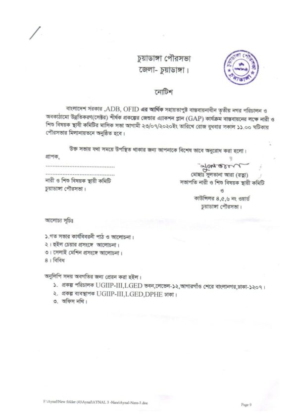 GAP কার্যক্রমের মাসিক সভার নোটিশ ও হাজিরা সিট